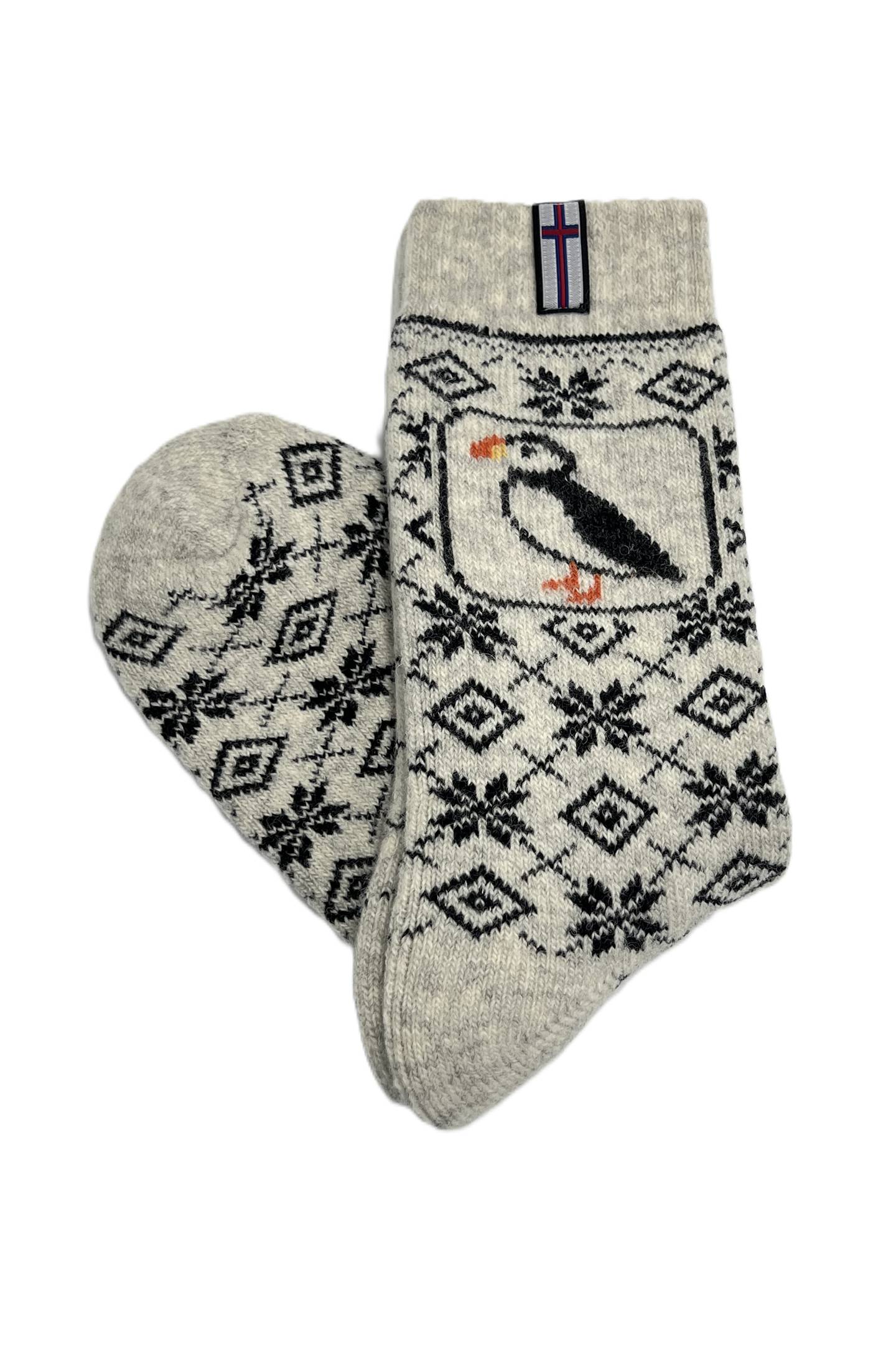 Warm and soft Scandinavian wool socks from WOOLWEAR of Scandinavia with beautiful puffin motif with snowflakes and a Faroese ribbon/flag at the ribb-edge.
